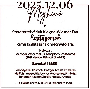 December 6-án (szombat) 15.00 Kielgas-Wiesner Éva „Ecsetnyomok” c. kiállításának megnyitója a gyülekezeti teremben.